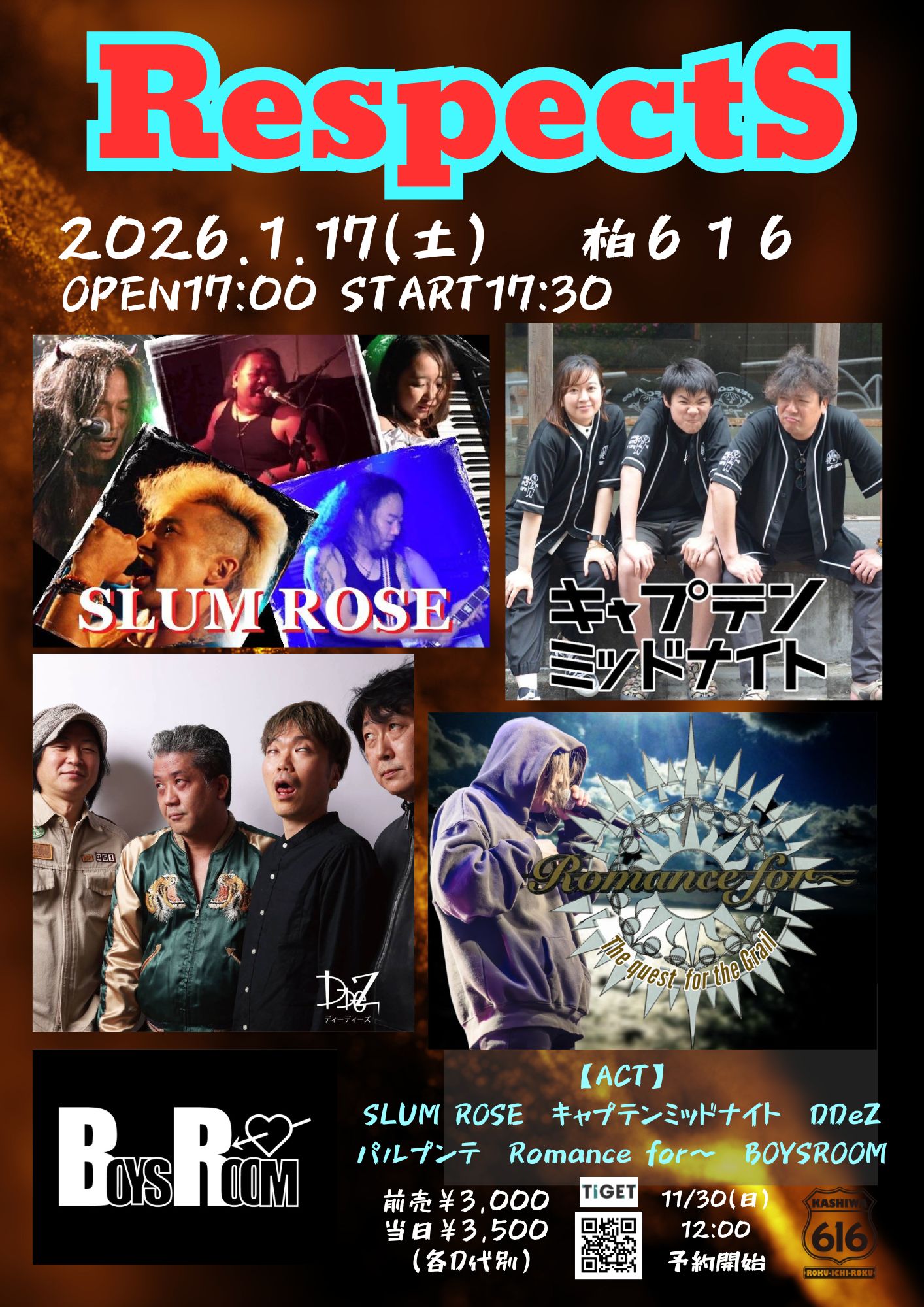 【出演】 DDeZ / SLUM ROSE / BOYSROOM キャプテンミッドナイト / パルプンテ / Romance for〜 OPEN17:00 START17:30 前売 ¥3,000 当日 ¥3,500 (各D代別) 【TIGET予約URL】 https://tiget.net/events/443237