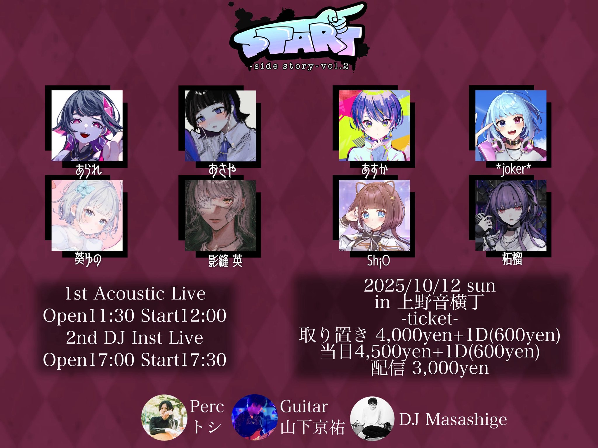 【出演】あられ / おさや / あすか / *joker* / 葵ゆの / 影縫 英 / ShiO / 柘榴 / トシ(Perc) / 山下京祐(Guitar) / DJ Masashige | |||