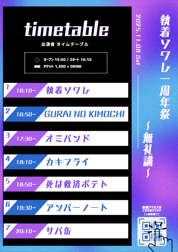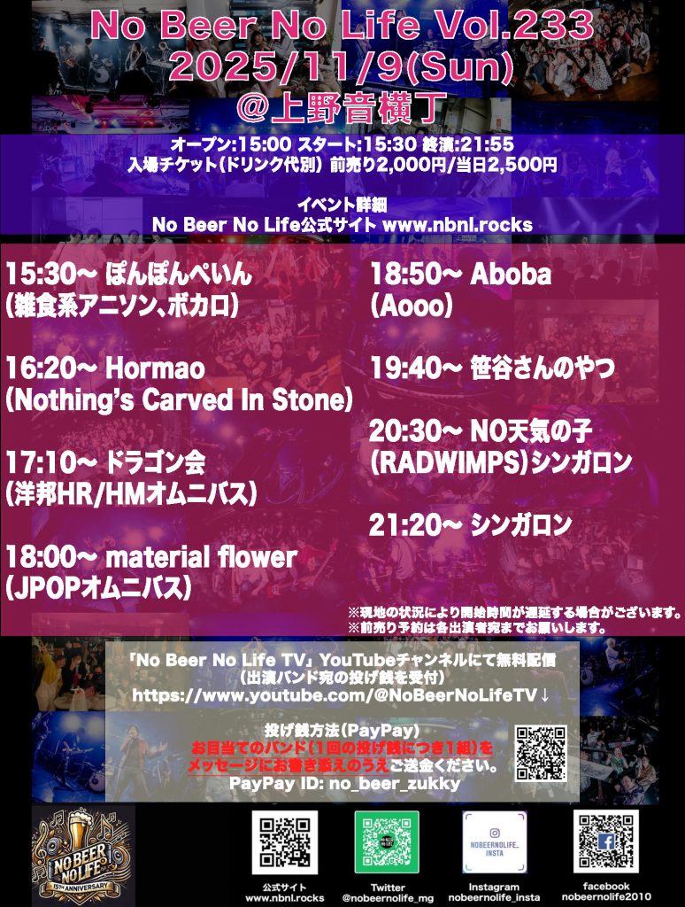 【出演】執着ソワレ / GURAI NO KIMOCHI / オミバンド / カキふらい / 死は救済ポテト / アンバーノート / サバ缶 | 9No Beer No Life Vol.233