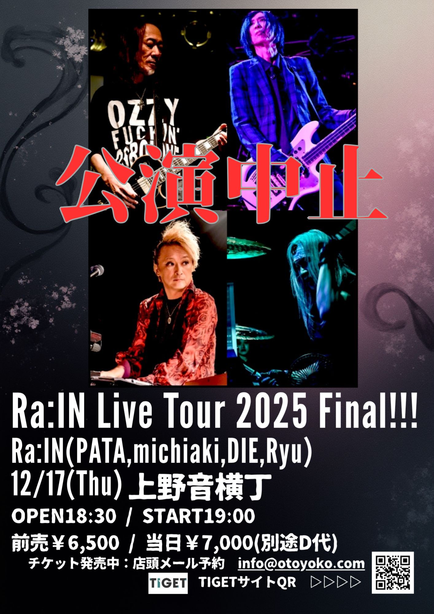 下記Ra:INからのお知らせです 下記、Ra:IN DIEさんからのコメントです 誠に不本意ではありますが、 関係各位、主催者、ならびに出演を楽しみにしていただいてるお客様には大変申し訳ない気持ちでいっぱいです 2025.12.10.DIE | 18芳賀企画&松永拓也presents Challenge!!