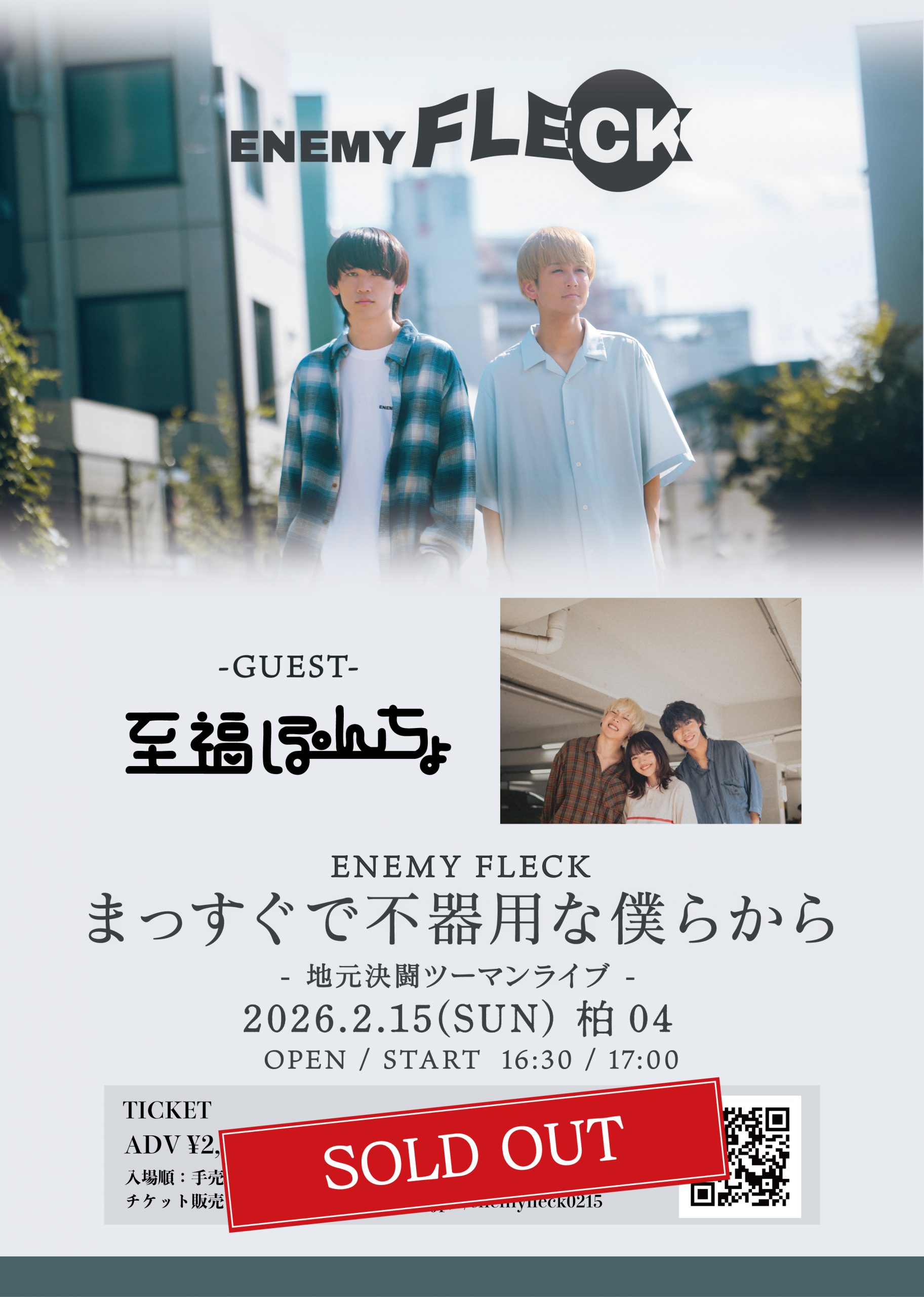 【出演】ENEMY FLECK / 至福ぽんちょ(GUEST BAND) 【時間】OPEN16:30 / START17:00 【料金】前売¥2,500(別途D代) 【TICKET】 SOLD OUT 【入場順】①手売チケット整理番号順→②LivePcket整理番号順
